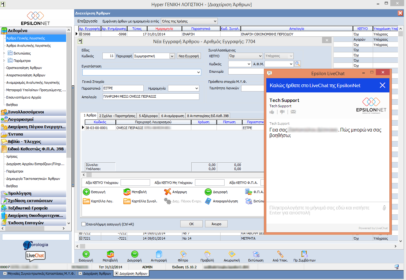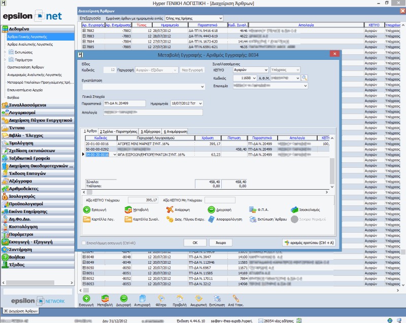 Μία ειδικά μελετημένη και σχεδιασμένη φόρμα αναλαμβάνει να μειώσει στο ελάχιστο το χρόνο καταχώρησης άρθρων και εγγραφών. Βελτιστοποιημένη συμπεριφορά ανεξαρτήτου μέσου εισαγωγής (ποντίκι / πληκτρολόγιο) και πρόσβαση μέσα από μία ενιαία φόρμα σε οτιδήποτε χρειαστείτε σχετικό με την καταχώρηση (καρτέλα λογαριασμού, καρτέλα συναλλασσομένου, καταχώρηση παγίου, ενημέρωση Intrastat & VIES κλπ).